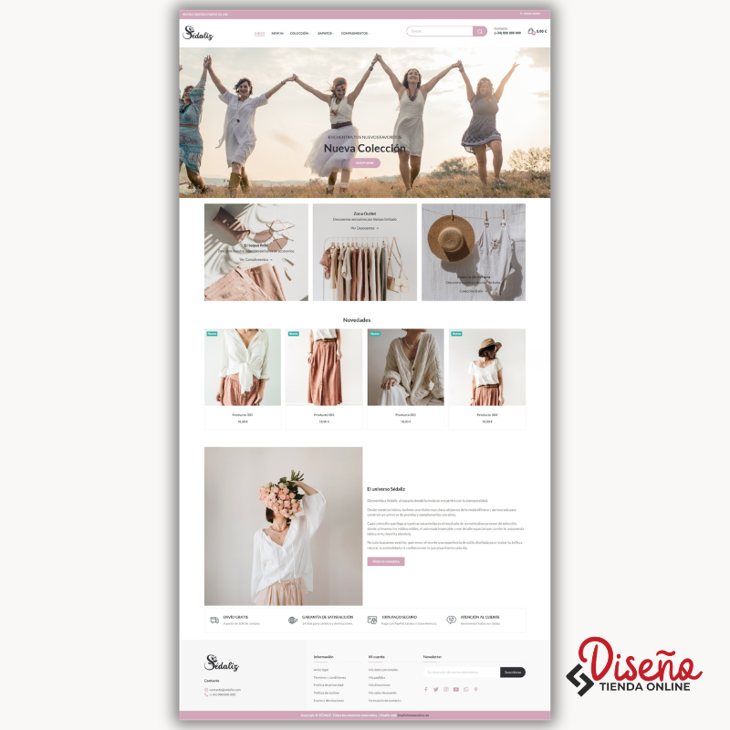El modelo Sédaliz es una propuesta para el sector de la moda. A diferencia de otros servicios «express» del mercado, en Diseño Tienda Online apostamos por la exclusividad: este diseño solo se venderá una vez. En el momento en que lo contrates, será eliminado de nuestro catálogo y nadie más podrá tener una tienda igual a la tuya.